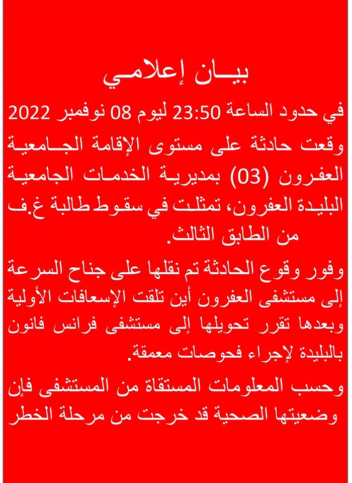 وبحسب ما أفاد الديوان في بيان إعلامي فقد وقعت الحادثة، المتمثلة في سقوط الطالبة غ.ف  في حدود الساعة 23.50 ليوم 8 نوفمبر 2022 على مستوى الإقامة الجامعية العفرون 3.