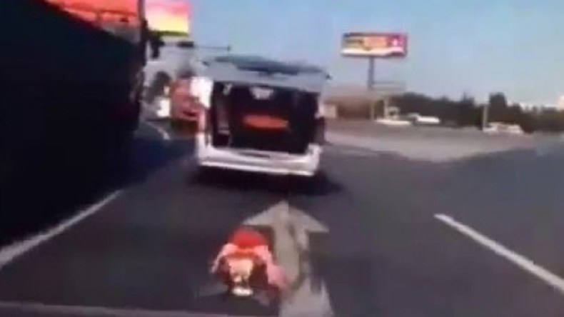 التقط مقطع فيديو صادم لطفل صغير سقط فجأة من صندوق السيارة أثناء سيرها في طريق سريع ،دون أن يشعر السائق بحدوث شيء غريب في مؤخرة المركبة.