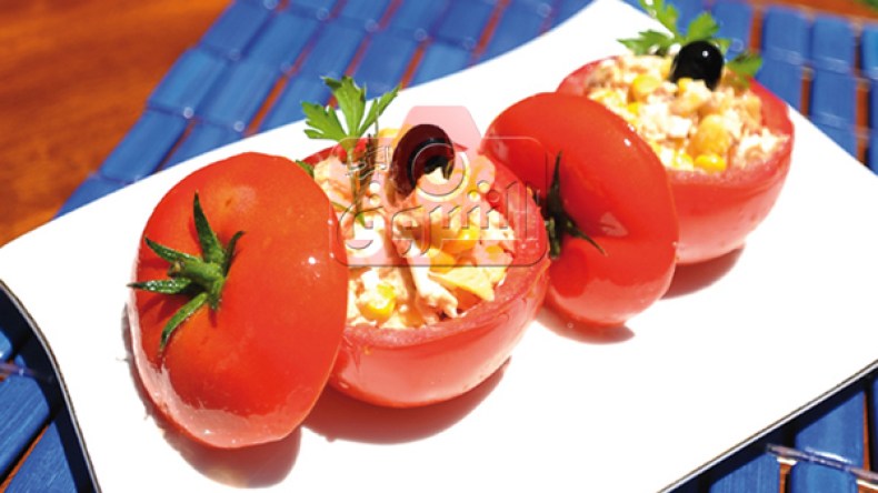 اقطعي الطماطم من الأعلى وافرغي اللب، ملحيها واقلبيها واتركيها تقطر من العصير ثم املئيها بالحشو وزينيها بالزيتون والبقدونس.