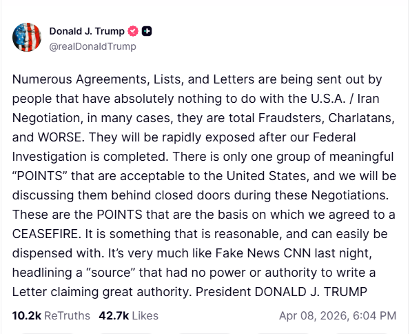 وقال ترامب في تدوينة عبر منصة “تروث سوشيال”: “يتم إرسال عدد هائل من الاتفاقيات والقوائم والرسائل من قبل أشخاص ليس لهم أي علاقة بتفاوض الولايات المتحدة وإيران، وفي كثير من الحالات هم محتالون تماما ودجالون وأسوأ من ذلك”.