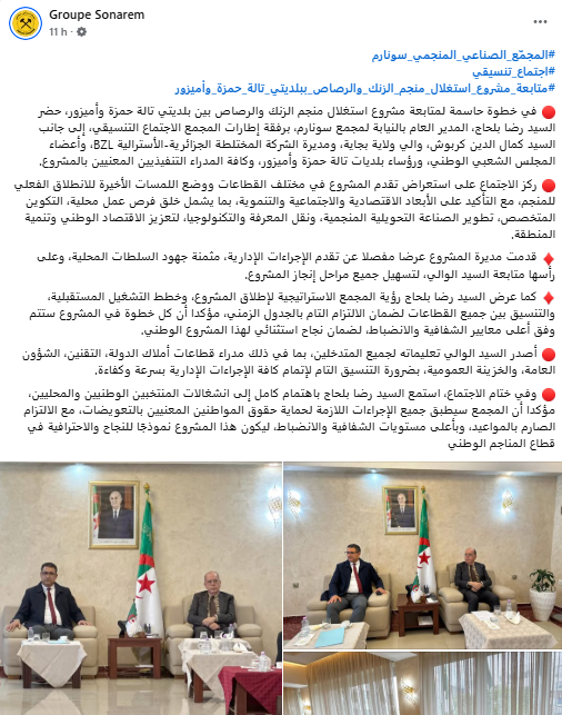 عقد المجمع الصناعي المنجمي سونارم اجتماعًا تنسيقيًا لمتابعة تقدم مشروع منجم الزنك والرصاص بين بلديتي تالة حمزة وأميزور، بحضور المدير العام بالنيابة للمجمع والي ولاية بجاية ومديرة الشركة المختلطة الجزائرية-الأسترالية BZL، إلى جانب أعضاء المجلس الشعبي الوطني ورؤساء البلديات.