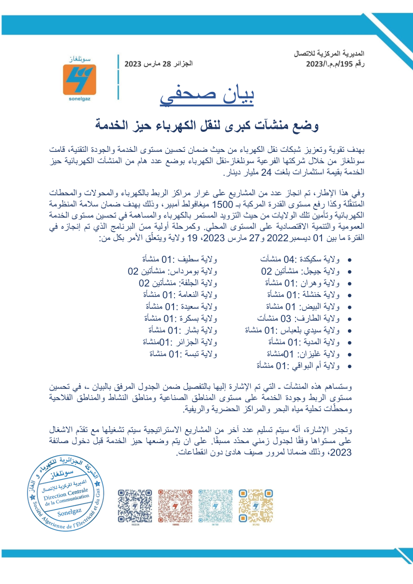 وأوضح مجمع سونلغاز في بانه له أنه تم انجاز عدد من المشاريع على غرار مراكز الربط بالكهرباء والمحولات والمحطات المتنقلة، وكذا رفع مستوى القدرة المركبة ب 1500 ميغافولط امبير، وذلك بهدف ضمان سلامة المنظومة الكهربائية وتأمين الولايات المعنية من حيث التزويد المستمر بالكهرباء والمساهمة في تحسين مستوى الخدمة العمومية والتنمية الاقتصادية على المستوى المحلي.