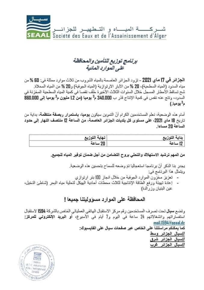 وحسبها: نحيطكم علما أن برنامج توزيع المياه الشروب المسطر يوم 7 أفريل 2021، خلال شهر رمضان للجزائر العاصمة يبقى سائر المفعول ولن يتم تغييره.