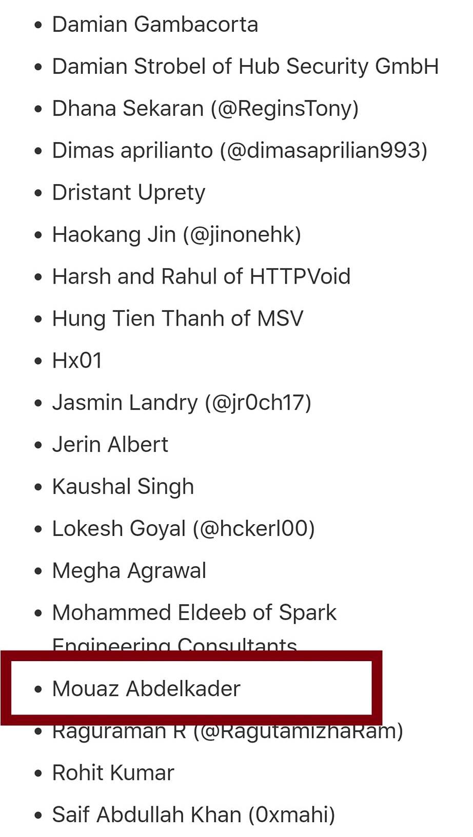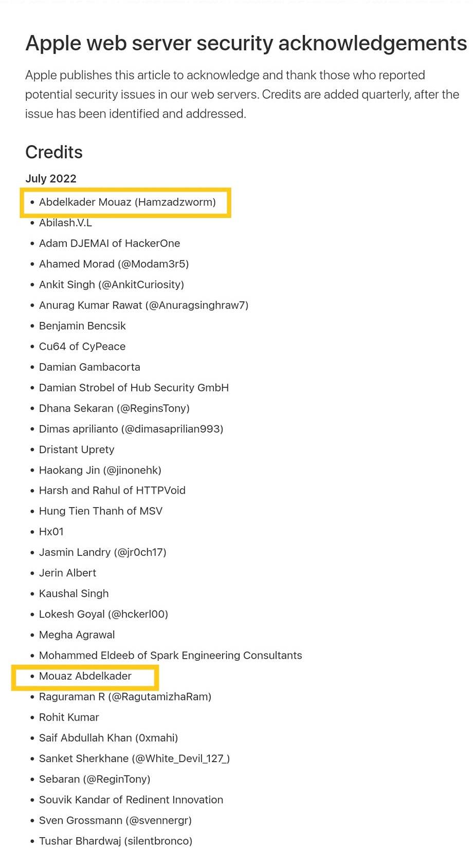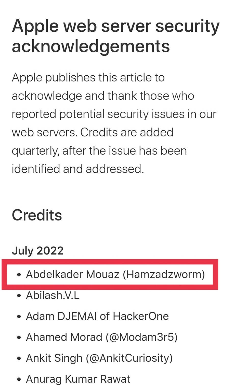 وكتبت شركة آبل عبر موقعها الرسمية “تنشر Apple هذه المقالة لتقدير وشكر أولئك الذين أبلغوا عن مشاكل أمنية محتملة في خوادم الويب الخاصة بنا. تتم إضافة الاعتمادات كل ثلاثة أشهر، بعد تحديد المشكلة ومعالجتها”.