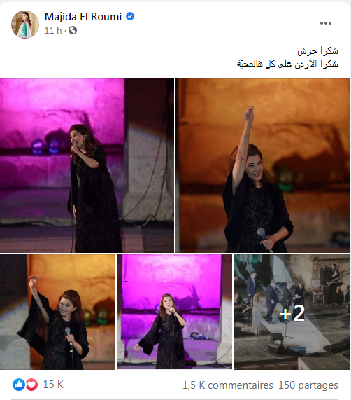 وتوجّهت الفنّانة اللبنانية ماجدة الرومي بالشكر للأردن، على “المحبة” التي أحيطت بها خلال الحفل، حيث نشرت تدوينة عبر حسابها على فيسبوك جاء فيها: “شكراً جرش…شكراً الأردن على كل هالمحبّة”.