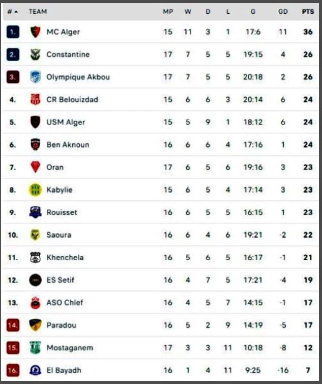 ونُشير إلى أن أولمبيك أقبو يملك نفس رصيد شباب قسنطينة (26 نقطة)، لكن الفريق الأخير يتفوّق بِمقياس فارق الأهداف (+4 مقابل +2)، وهو سرّ استئثاره بِمركز الوصافة.