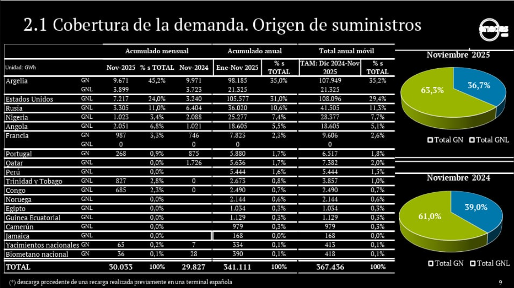 تمكنت الجزائر من الحفاظ على مركزها الريادي في قائمة مصدّري الغاز الطبيعي إلى اسبانيا، خلال الفترة الممتدة من جانفي إلى نوفمبر 2025، وفق تقرير مشغّل شبكة الغاز الإسبانية Enagás.