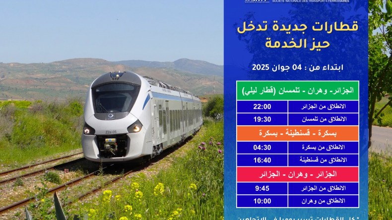 أعلنت الشركة الوطنية للنقل بالسكك الحديدية في بيان لها اليوم الإثنين، 2 جوان، عن تدعيم الخطوط الحالية وكذا خلق خطوط جديدة لربط مختلف الولايات، وذلك ابتداء من 4 جوان.