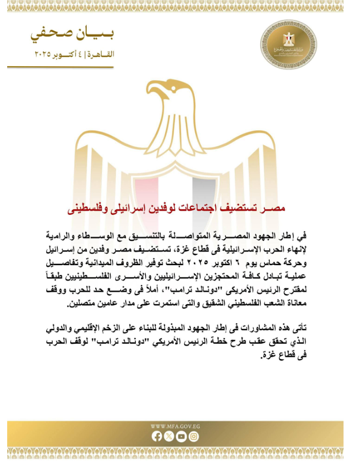 وأكدت وزارة الخارجية المصرية في بيان لها، أن هذه المشاورات تأتي في إطار الجهود المبذولة للبناء على الزخم الإقليمي والدولي الذي تحقق عقب طرح خطة الرئيس الأمريكي دونالد ترامب لوقف الحرب في قطاع غزة.