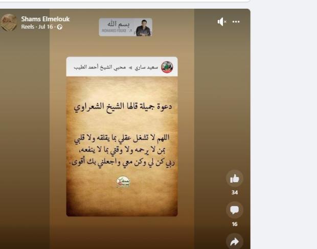 “دعوة جميلة قالها الشيخ الشعراوي، اللهم لا تشغل عقلي بما يقلقه، ولا قلبي بمن لا يرحمه، ولا وقتي بما لا ينفعه، ربي كن لي وكن معي، واجعلني بك أقوى”.