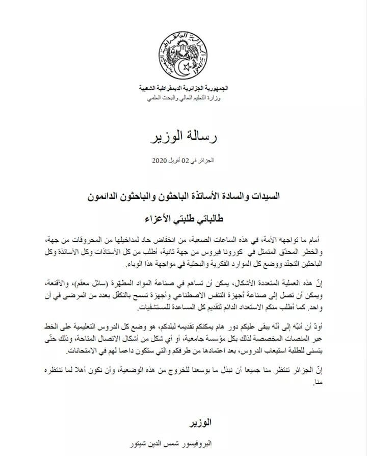 ونبّه وزير التعليم العالي إلى “أنّه يبقى عليكم دور هام يمكنكم تقديمه لبلدكم، هو وضع كل الدروس التعليمية على الخط عبر المنصات المخصصة لذلك بكل مؤسسة جامعية، أو أي شكل من أشكال الاتصال المتاحة، وذلك حتّى يتسنى للطلبة استيعاب الدروس، بعد اعتمادها من طرفكم والتي ستكون داعما لهم في الامتحانات”.