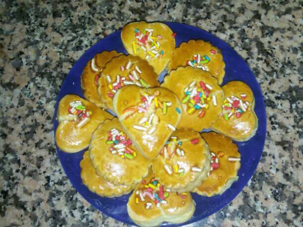 ابسطي العجينة على طاولة العمل و بأي طابع متوفر اطبع العجينة ثم ضعيها  على الصينية وادهنيها بصفار بيضة ونزينها بالسكر أو الحلوى الملونة.