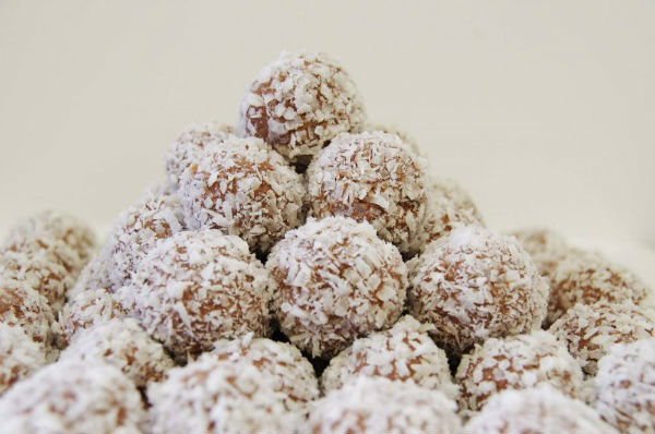 خذي القليل من الخليط وشكليه على هيئة كُرة ثم اغمسيها في جوز الهند إلى أن تتغطى الكُرة كاملةً .