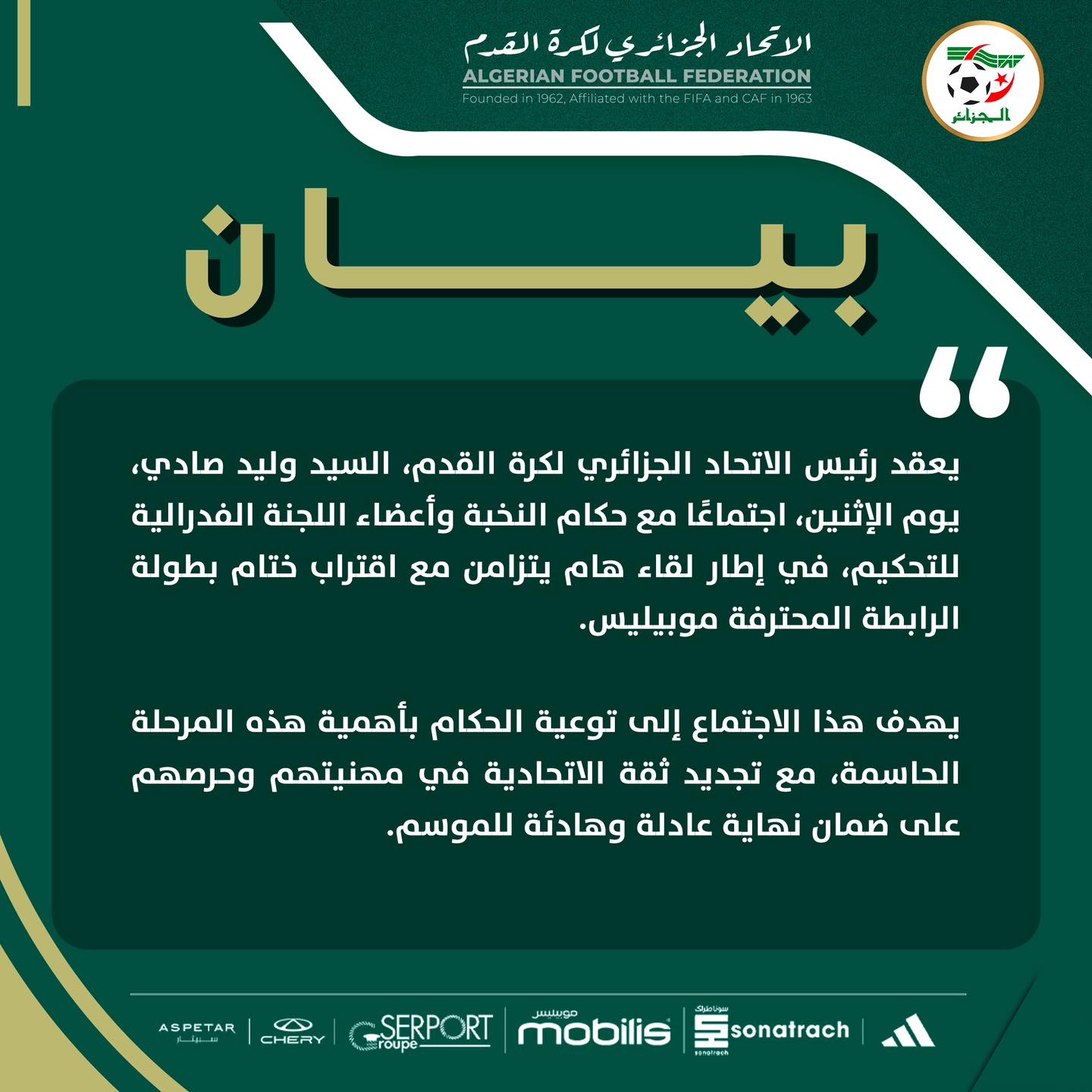 يعقد رئيس الاتحاد الجزائري لكرة القدم، وليد صادي، هذا الإثنين، اجتماعا مع حكام النخبة وأعضاء اللجنة الفيدرالية للتحكيم.