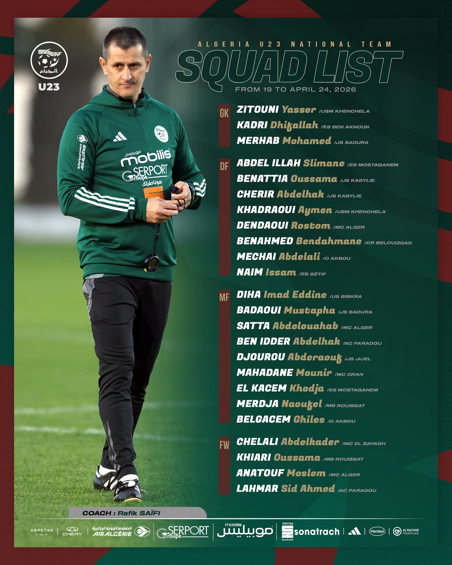 كشف مدرب المنتخب الوطني لأقل من 23 سنة، رفيق صايفي، عن قائمة اللاعبين المعنيين بالتربص التحضيري.