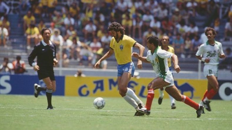 الجزائري محمد قاسي سعيد يُراقب البرازيلي الرّاحل سقراط (سكراتاس)، في مباراة الجولة الثانية من دور المجموعات لِمونديال المكسيك 1986.