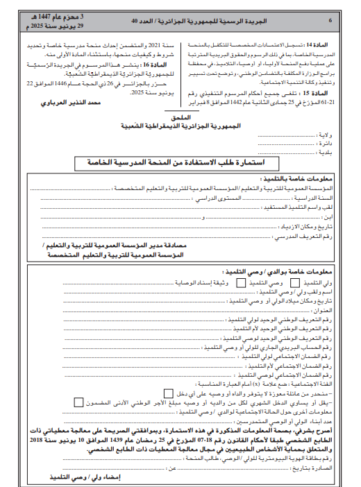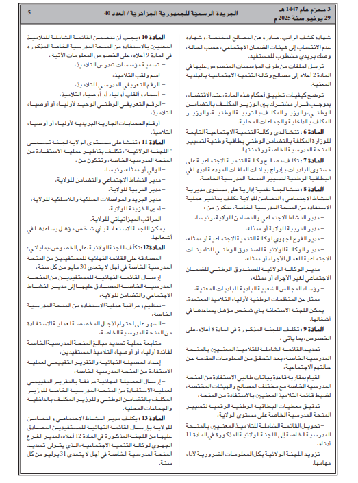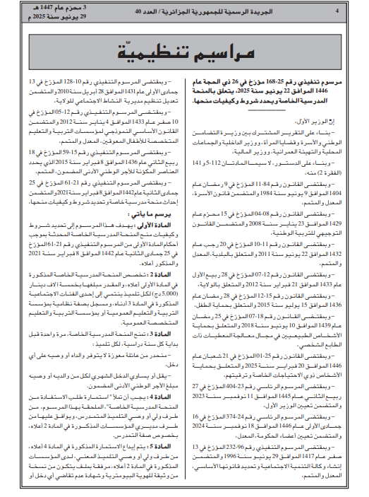 وللاطلاع على تفاصيل المرسوم وشروط الاستفادة من المنحة، يمكن الرجوع إلى النص الكامل عبر الرابط الآتي: https://www.joradp.dz/FTP/jo-arabe/2025/A2025040.pdf