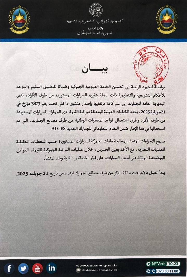 ويحمل المنشور رقم 3873 المؤرخ في 21 جويلية 2025، ويأتي ضمن جهود الجمارك الجزائرية لتحسين جودة الخدمة العمومية وضمان تطبيق موحد ودقيق للأحكام التشريعية والتنظيمية المتعلقة بتقييم السيارات المستوردة من طرف الأفراد.