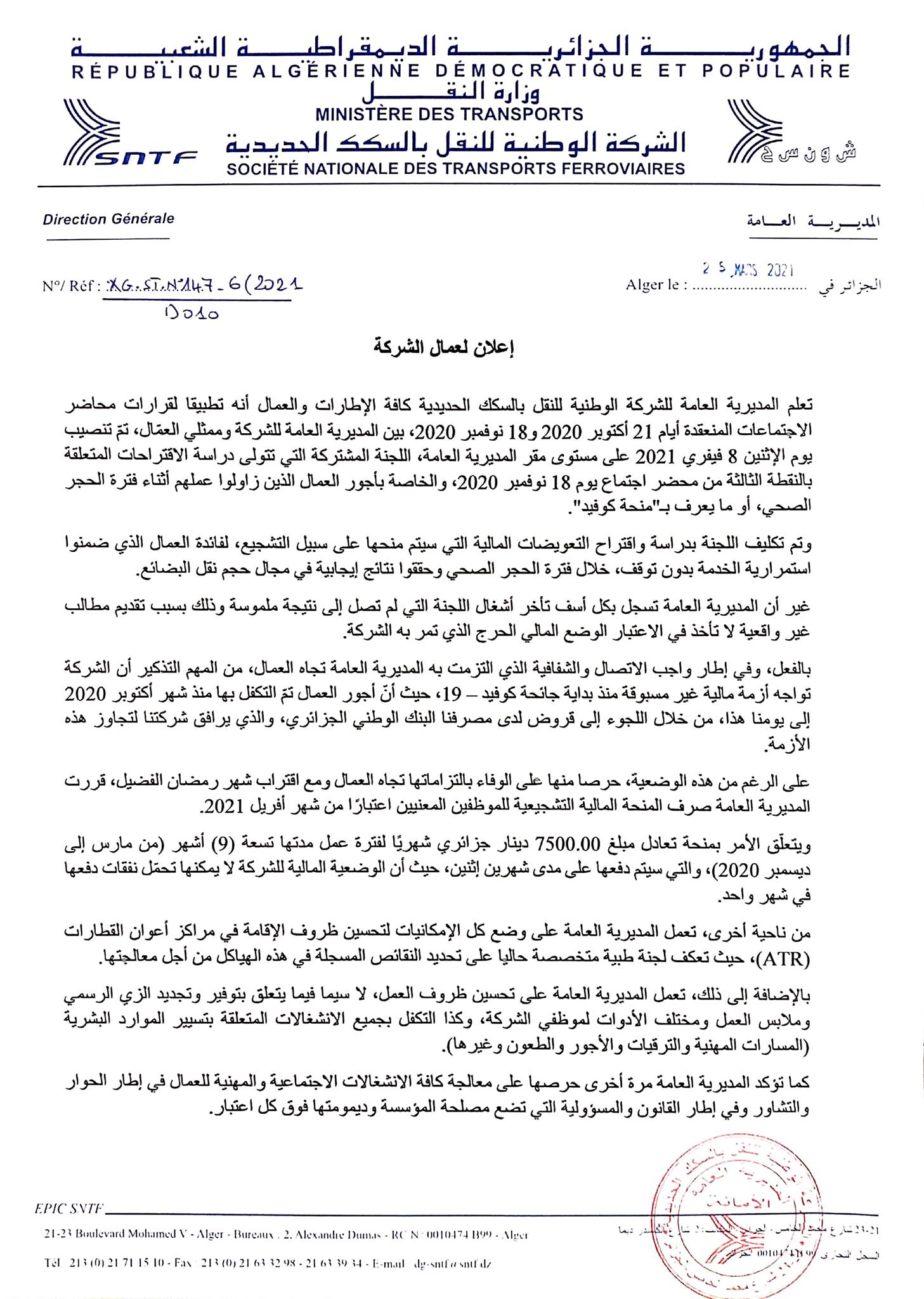 كشفت المديرية العامة للشركة الوطنية للنقل بالسكك الحديدية، عن صرف مالية تشجيعية للموظفين الذين ضمنوا استمرارية الخدمة بدون توقف، خلال فترة الحجر الصحي اعتبارًا من شهر أفريل 2021.