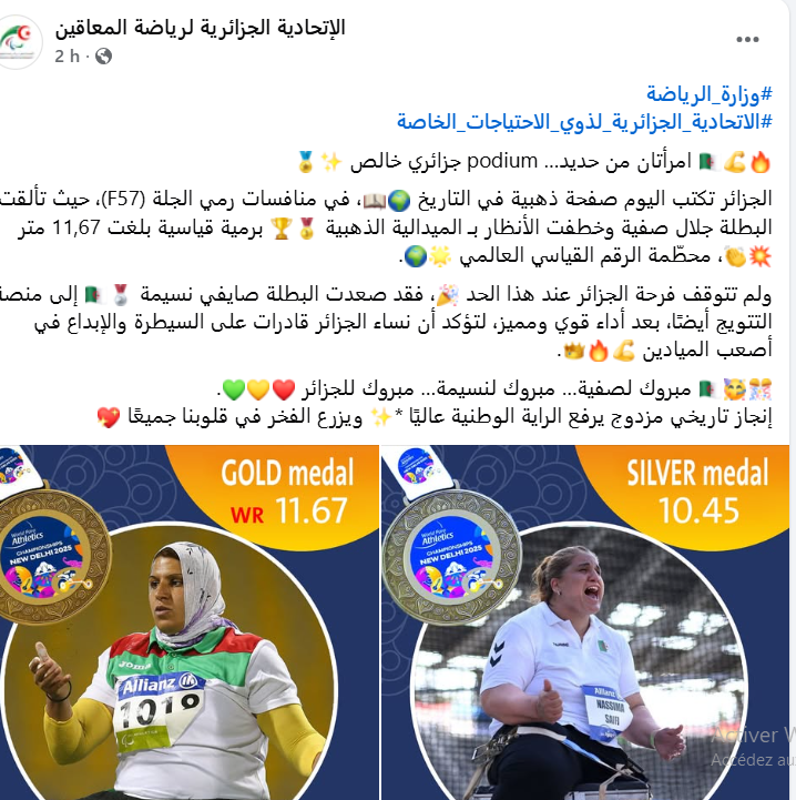 أهدت البطلة صفية جلال الجزائر، ميدالية ذهبية في رمي الجلة، ضمن منافسات بطولة العالم لألعاب القوى لذوي الهمم الجارية بنيودلهي.