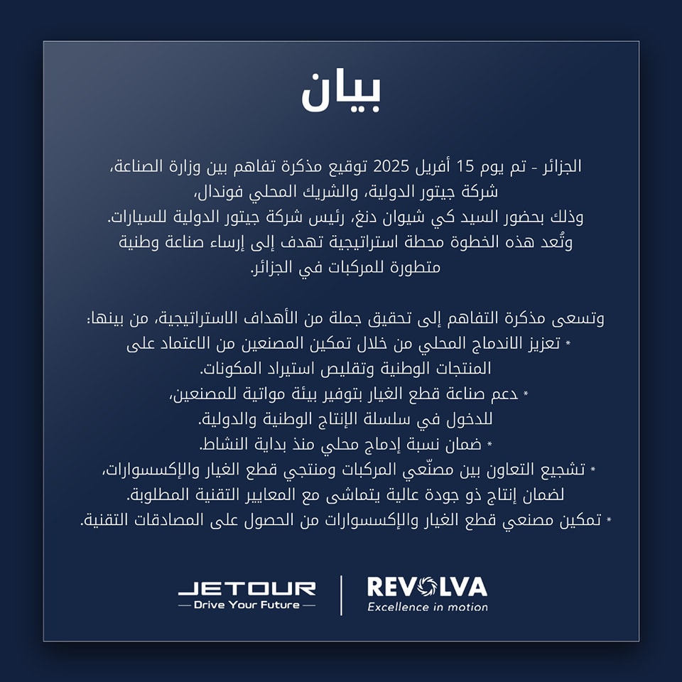 تم توقيع مذكرة تفاهم هامة بين وزارة الصناعة وشركة جيتور الدولية، بالشراكة مع الفاعل المحلي “فوندال”، وذلك بحضور رئيس شركة جيتور الدولية للسيارات، “كي شيوان دنغ”. وتمثل هذه الاتفاقية خطوة استراتيجية في مسار تطوير صناعة وطنية متكاملة ومتطورة في مجال المركبات بالجزائر.