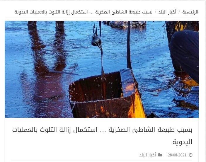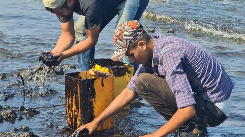 وتظهر في الصورة ما يبدو أنها بقعة نفط تلوّث شاطئاً، فيما يعمل أشخاص على إزالته يدويّاً.