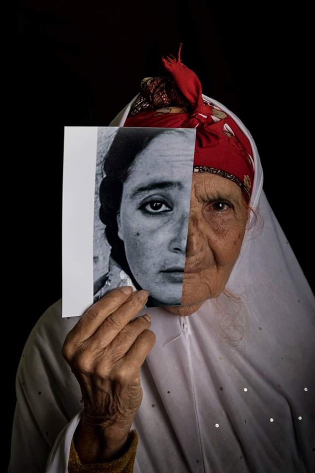 ما بين الأمس واليوم، سيدة تمسك صورة قديمة لها وهي تتأمل ملامح وجهها كيف كانت أيام شبابها، يقول مصور اللقطة:الوقت يمر بسرعة خاصة لمن لم يستغله ويترك بصمته”.