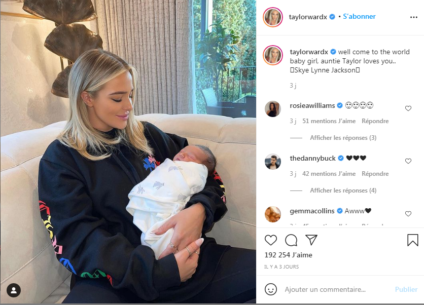 ونشرت تايلور وارد صورة لها وهي تحمل الرضيعة، وكتبت: “أهلا بك في العالم أيتها الطفلة، العمة تايلور تحبك”.
