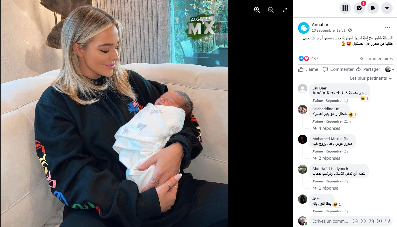 أثارت صورة نشرتها زوجة النجم الجزائري رياض محرز، مؤخرا، عبر حسابها الرسمي على إنستغرام جدلا كبيرا، بعدما ظهرت وهي تحمل طفلة حديثة الولادة.