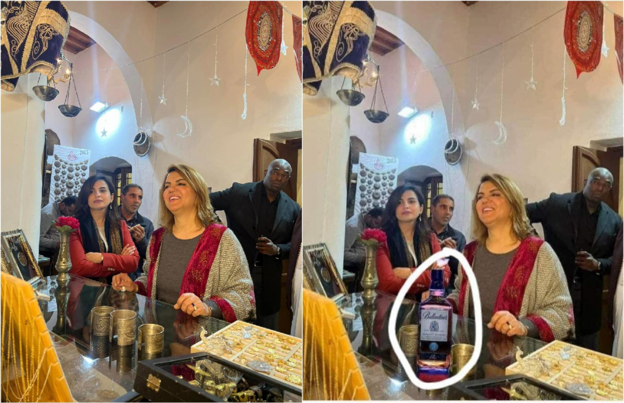 تظهر في الصورة المثيرة للجدل نجلاء المنقوش داخل ما يبدو أّنه سوقٌ للحليّ، وتبدو أمامها زجاجة من الكحول.