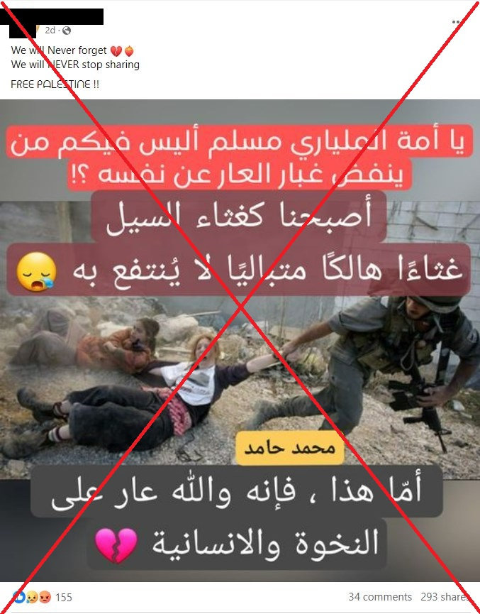 يظهر في الصورة رجل بلباس عسكري، وهو يجرّ امرأة على الأرض بالقوة، وعلى مقربة منها فتاة. وجاء في التعليقات المرافقة، أن الصورة لـ”جندي إسرائيلي يعتدي على شابتين فلسطينتين”.