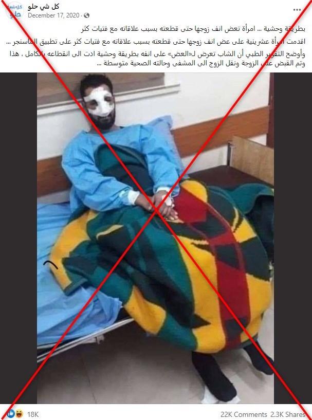ويظهر في الصورة رجلٌ يجلس على سرير في مركز طبيّ وقد غطّت الضمّادات أنفه وجبينه، وجاء في النصّ المرافق: “بطريقة وحشية … امرأة تعضّ أنف زوجها حتى قطعته بسبب علاقاته مع البنات”.