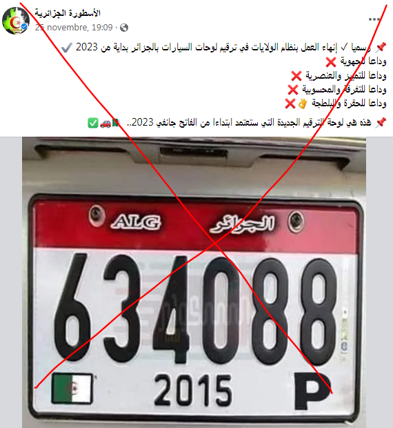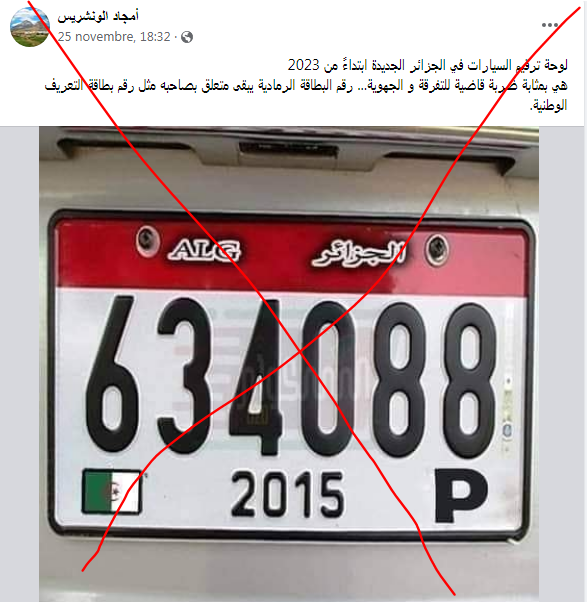 وجاء في أحد المنشورات التي تداولت الصورة:”هذه هي لوحة الترقيم الجديدة التي ستعتمد ابتداء من جانفي 2023″.