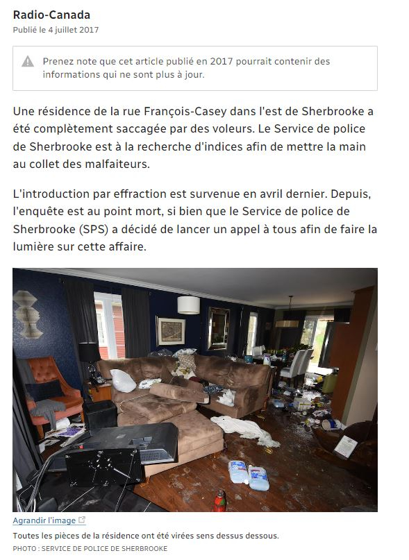 وبحسب هذه المواقع، فإن منزلاً في مدينة شيربروك في جنوب مقاطعة كيبك الكندية تعرّض للسرقة حيث بلغت كلفة الممتلكات المسروقة ما يقارب من 130 ألف دولار.