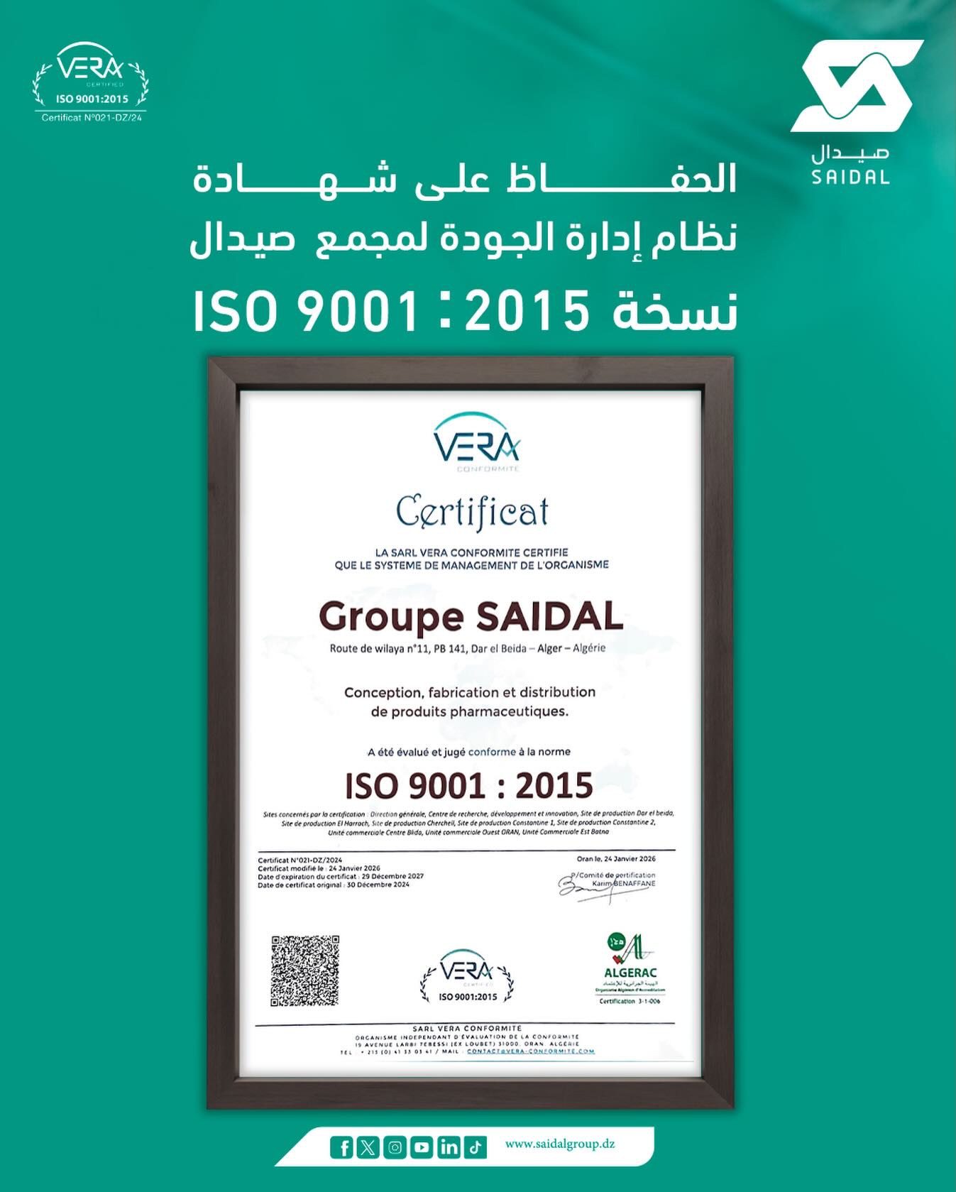 أعلن مجمع صيدال عن حفاظه على شهادة نظام إدارة الجودة وفق المعيار ISO 9001 النسخة 2015، بعد حصوله على الشهادة المحدَّثة رقم 021-DZ/2024 من هيئة الشهادات VERA CONFORMITÉ.