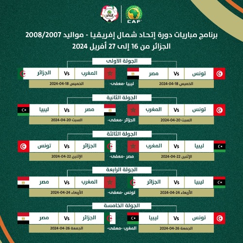 ضُبط مساء الثلاثاء بِتونس جدول مقابلات دورة اتحاد شمال إفريقيا لِكرة، صنف أقلّ من 17 سنة.