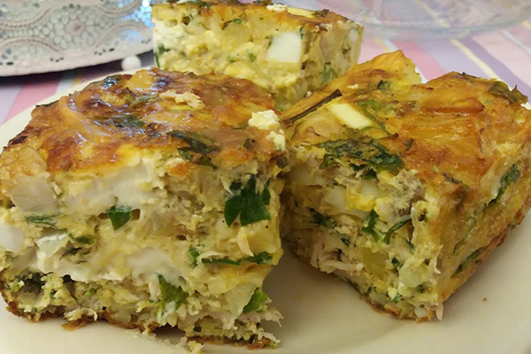 1 صدر دجاج مسلوق ومقطع مكعبات صغيرة، 1 بصل مفروم، 1/2 كوب زيتون أخضر شرائح، 2 بيض، 2 ملعقة كبيرة بقدونس مفروم، 1/2 كوب جبن مبشور، 1 ملعقة كبيرة زيت، ملح وفلفل أسود بحسب الرغبة.