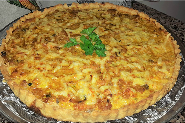 – دخلي القالب إلى فرن محمى مسبقاً ويُترك حتى تنضج الكيش بالدجاج ويتحمر وجهها.