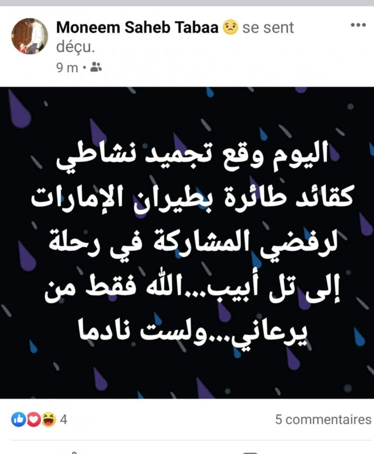 يأتي ذلك بعدما تداول ناشطون عبر مواقع التواصل الاجتماعي، رسالة لما زعموا أنه طيار تونسي يدعى منعم صاحب الطابع، يتهم فيها طيران الإمارات بتجميد نشاطه؛ لرفضه المشاركة في رحلة إلى تل أبيب.