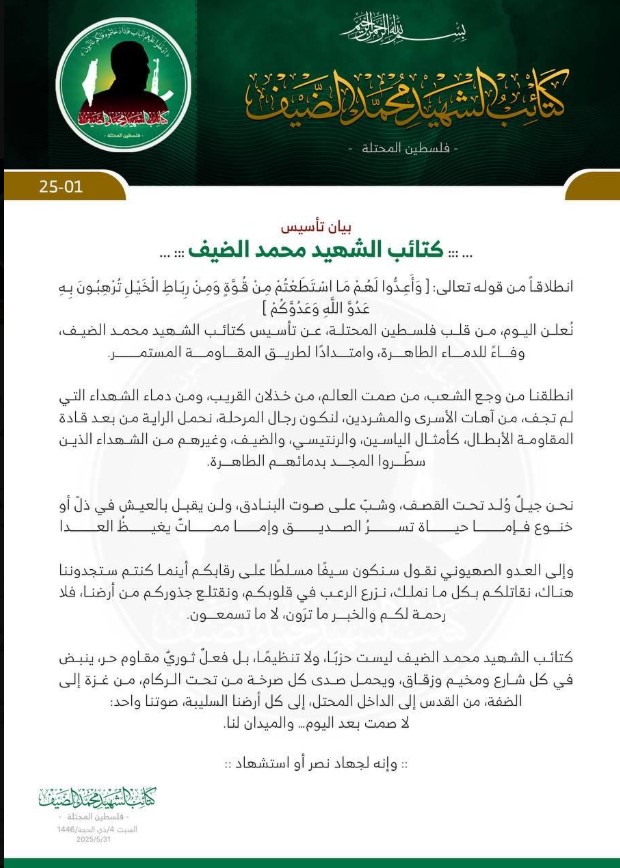 وتم الإعلان عن تأسيس هذه الكتائب بتاريخ 31 ماي الماضي عبر منصة تلغرام، حيث جاء في البيان: “من قلب فلسطين المحتلة نعلن عن تأسيس كتائب الشهيد محمد الضيف وفاء للدماء الطاهرة وامتداداً لطريق المقاومة المستمر”.