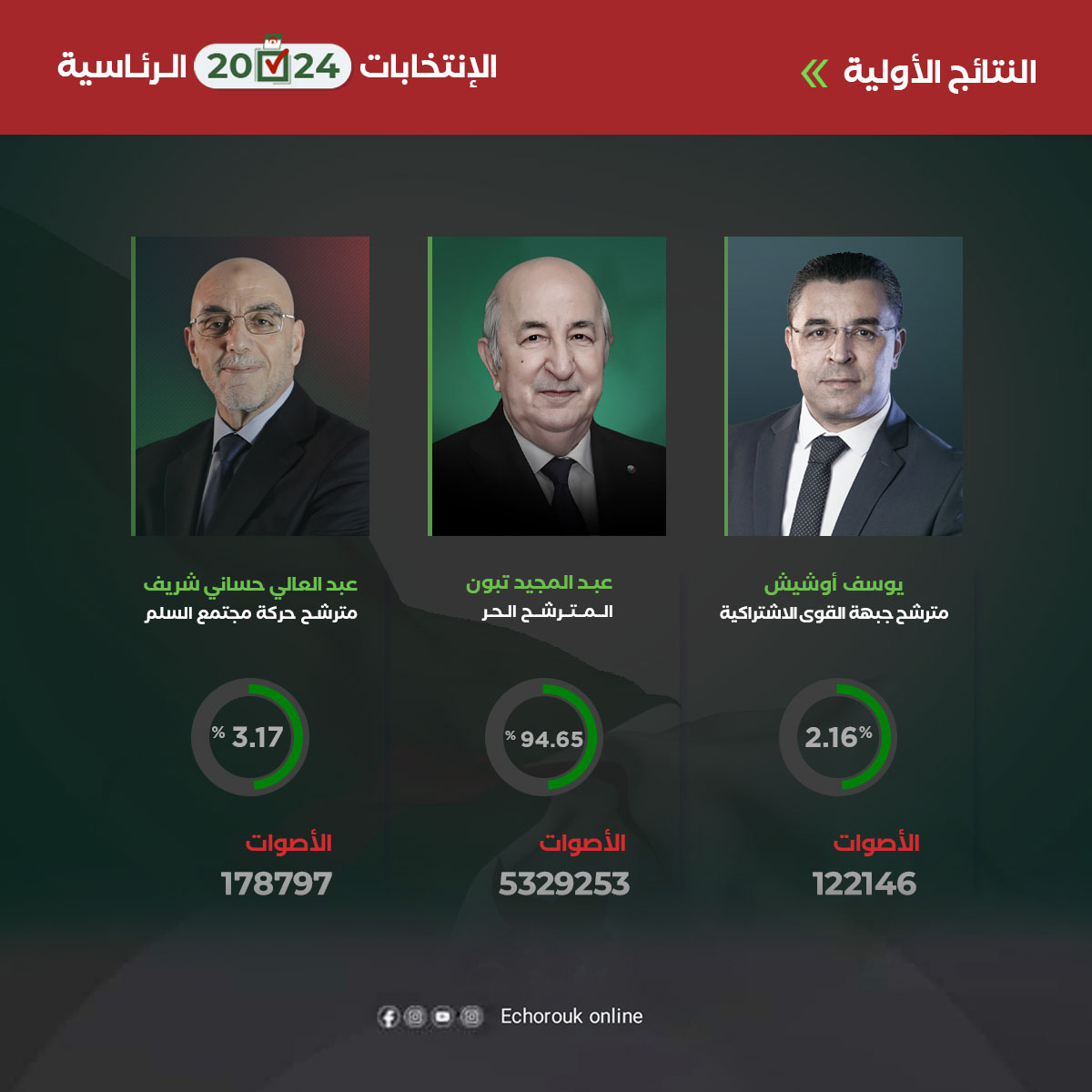 أعلن رئيس السلطة الوطنية المستقلة للانتخابات، محمد شرفي، في ندوة صحفية مساء اليوم الأحد، 8 سبتمبر، عن انتخاب السيد عبد المجيد تبون رئيسا لعهدة ثانية بنسبة 94.65 %.