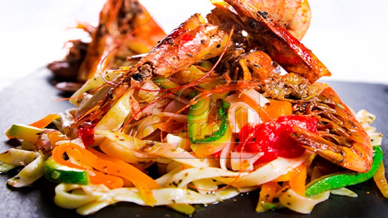 في مقلاة نضع الزيت ونقلي الثوم والبصل ثم نضيف الجزر مقطع رفيع، نتركه يتقلى ثم  نضيف  القرعة، الطماطم مقطعة، الجمبري،التوابل، ثم نترك المقادير تنضج، عندما ينضج الجمبري والخضار نتحصل على صلصة ننزع الجمبري ونخلط عجينة التقلياتال مع الصلصة ثم نقدمها في صحن التقديم ونزينها بالجمبري.