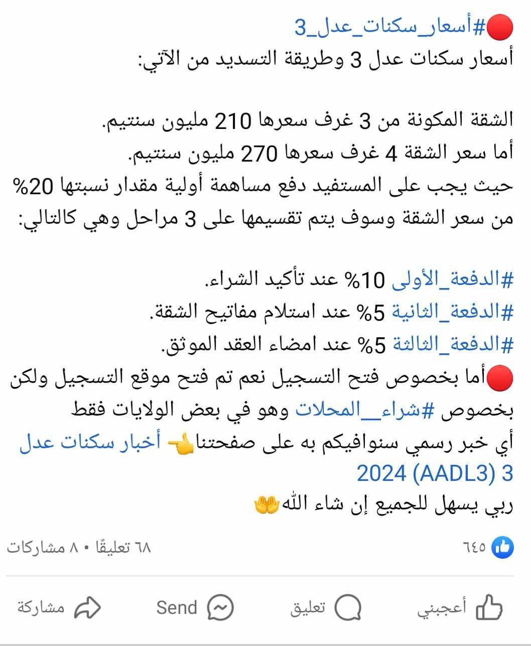 كان الإعلان عن برنامج البيع بالإيجار فرصة لظهور عشرات الصفحات والمجموعات على فيسبوك التي تتحدث عن عدل 3 وكأنها مفوضة من جهة رسمية.