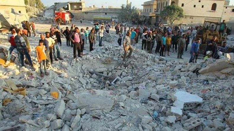 سكان في موقع تعرض لقصف جوي في إدلب - 9 ماي 2016