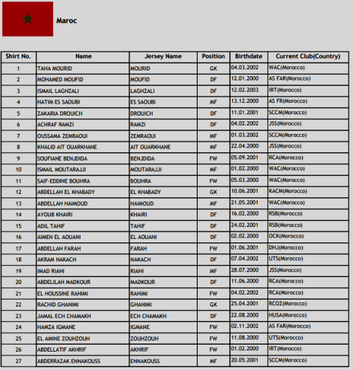 2- أرسل اتحاد الكرة المغربي مُؤخّرا إلى “الكاف” قائمة لاعبي “شان” الجزائر 2023، وقد اعتمد على منتخب فئة أقلّ من 23 سنة (صنف الآمال بِلغة الإعلام الرياضي الجزائري، أو الأولمبي بِلغة المشارقة)، كما يُبرزه الجدول الرّابع والأخير المُدرج أدناه. واللّوائح تقول إن أي منتخب يحضر إلى “الشان” بِفريق آخر، يُجْبِرُ “الكاف” على معاقبته (المادّة الـ 81).