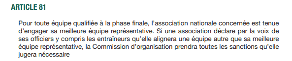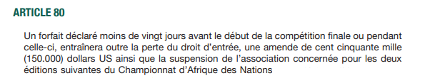 1- إذا بقي أقلّ من 20 يوما عن انطلاق منافسة “الشان”، فإن المنتخب المُنسحب يُعاقَب بِتسديد غرامة مالية قيمتها 150 ألف دولار (أكثر من مليارَي سنتيم)، وإقصائه من حضور النّسختَين المُواليتَين. وفي طبعة 2023، انطلقت المسابقة ومرّت ثلاثة أيّام، ولم يحضر منتخب فوزي لقجع (المادة الـ 80).