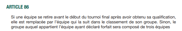3- إدراج المنتخب المُنسحب من “الشان” في ذيل ترتيب الفوج الذي كان ينتمي إليه في دور المجموعات، وتدوين خسارته كلّ مقابلاته بِنتيجة واحدة مُرادفة لِثلاثية نظيفة.