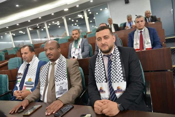 كما حمل نواب برلمانيون ووزراء في الحكومة وشاحا يحمل الراية الفلسطينية وعبارات تشيد بالمقاومة، على غرار “القدس لنا” و”نحن قادمون”.