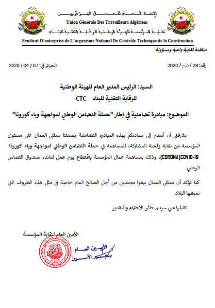 أطلقت نقابة المؤسسة للهيئة الوطنية للرقابة التقنية للبناء، مبادرة تضامنية في إطار الحملة الوطنية لمواجهة وباء كورونا في الجزائر.