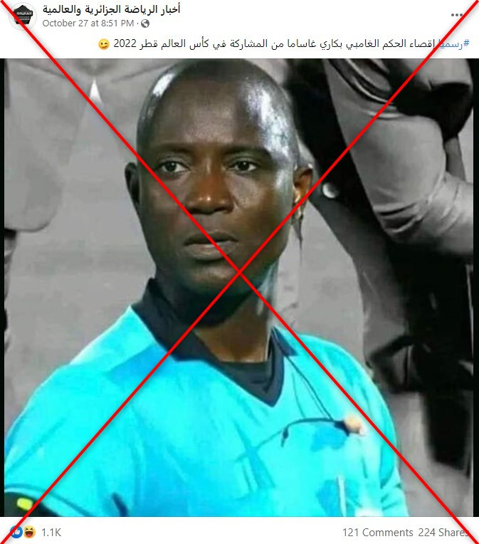 تتضمّن المنشورات صورة للحكم الغامبي بكاري غاساما مرفقة بالتعليق “رسمياً إقصاء الحكم الغامبي بكاري غاساما من المشاركة في كأس العالم قطر 2022”.